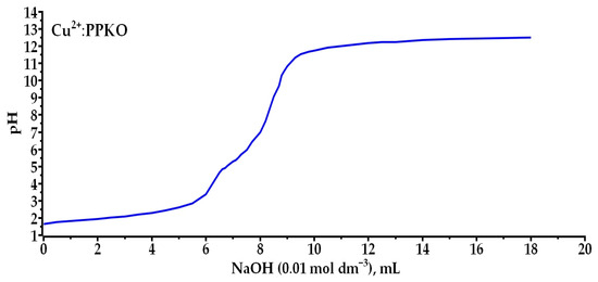 Potentiometric titration curves of the Cu:PPKO system in 96% ethanol: CM = 5.00 × 10−3 mol dm−3, CL = 0.01 mol dm−3, CNaOH = 0.01 mol dm−3, T = 298.15 K, V = 0.1 dm3.
