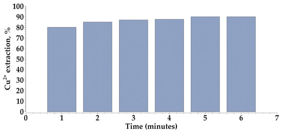The selection of a standard agitation time of 5 min (Figure 5) for all subsequent experiments ensured equilibrium conditions without the need to apply complex kinetic models. This decision is supported by previous studies indicating that, in systems employing extractants with high affinity for Cu(II), such as oxime-based compounds, detailed kinetic modeling may be unnecessary and may not provide additional value in terms of process optimization [37].