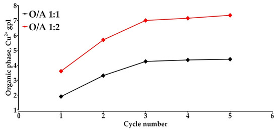 The experimental findings enabled the determination of the maximum loading capacity of the extractant phenyl-2-pyridyl ketoxime (PPKO) for Cu(II) ions in organic–aqueous biphasic systems. Notable variations in copper accumulation within the organic phase were identified as a function of the organic-to-aqueous phase ratio (O/A), thereby underscoring the significant impact of the phase ratio on the loading performance of the extraction system.