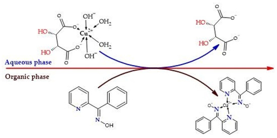 Transfer of Cu2+ ions from an alkaline aqueous solution in the presence of tartrate ions to an organic phase of phenyl-2-pyridyl ketoxime (PPKO) as extractant in chloroform.