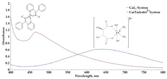 Comparative UV–Vis profile of the Cu(PPKO)2 and Cu(tartrate)2− systems.