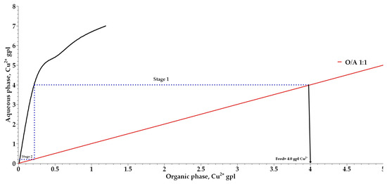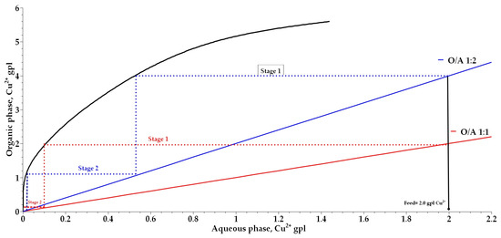 McCabe–Thiele diagram for copper extraction using 2% (w/v) phenyl-2-pyridyl ketoxime.