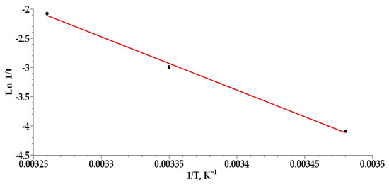 The temperature-dependent complexation of Cu(II) ions with PPKO was analyzed through a plot of Ln(1/t) versus 1/T (Figure 12), which exhibited a linear fit, indicating a strong correlation between Cu(II)–PPKO complex formation and the system temperature. The reaction times required to reach a potential of 246 mV were found to be 60, 20, and 8 s at 287 K, 298.5 K, and 306 K, respectively, enabling the determination of whether the process is exothermic or endothermic. The linearization yielded a negative slope, directly associated with the −ΔH/R term of the modified Van ’t Hoff equation, from which a reaction enthalpy of +75.73 kJ·mol−1 was calculated. The positive value of ΔH indicates that the Cu(II)–PPKO complexation process is endothermic, implying that an increase in temperature promotes complex formation.