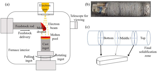 Principle of EBM and rod materials. (a) Schematic diagram of EBM; (b) DZ125 revert ingot; (c) sampling schematic diagram.