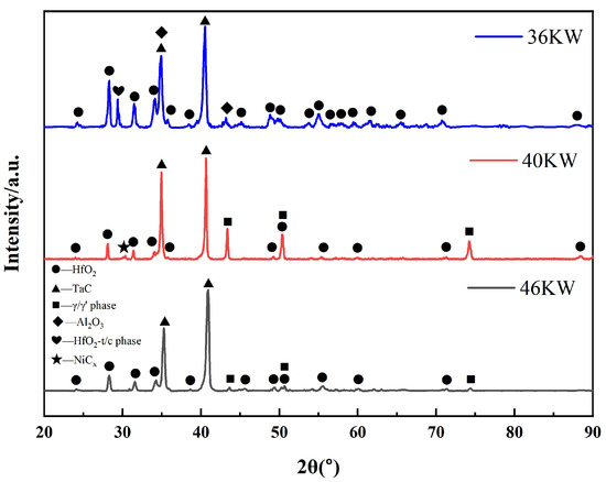 Phase analyses of the final solidification zone surfaces were conducted for DZ125 scrap after electron-beam drop melting at different powers (36 kW, 40 kW, and 46 kW), with results shown in Figure 4. The surface of the final solidification zone after 36 kW electron-beam melting contains substances such as HfO2, TaC, and Al2O3. However, Al2O3 was not detected on the surfaces of the final solidification zones after electron-beam melting at 40 kW and 46 kW. This may be attributed to the decomposition of Al2O3 promoted by the increased temperature with higher melting power, or the fact that it was encapsulated by HfO2, and thus not detected.