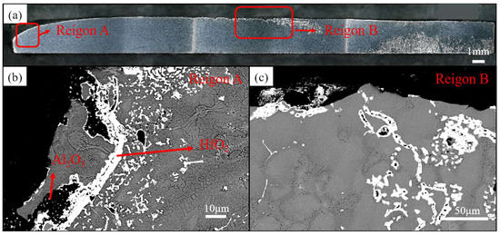 Figure 5a shows the cross-sectional microstructure of the final solidification zone, with the edge and core regions arranged sequentially from left to right. Figure 5b,c present enlarged views of the edge and core regions, respectively, where large-sized irregular filamentous HfO2 is observed to encapsulate fine Al2O3 particles. Due to the high density of HfO2, which hinders its upward migration to the surface, the overall density decreases after encapsulating Al2O3, facilitating its upward floating to the surface and solidification in the surface and near-surface layers of the final solidification zone. The observation of refractory oxides in the final solidification zone indicates the presence of an oxide floating mechanism for removing inclusions from the ingot, and the underlying mechanism will be specifically analyzed in the subsequent sections.