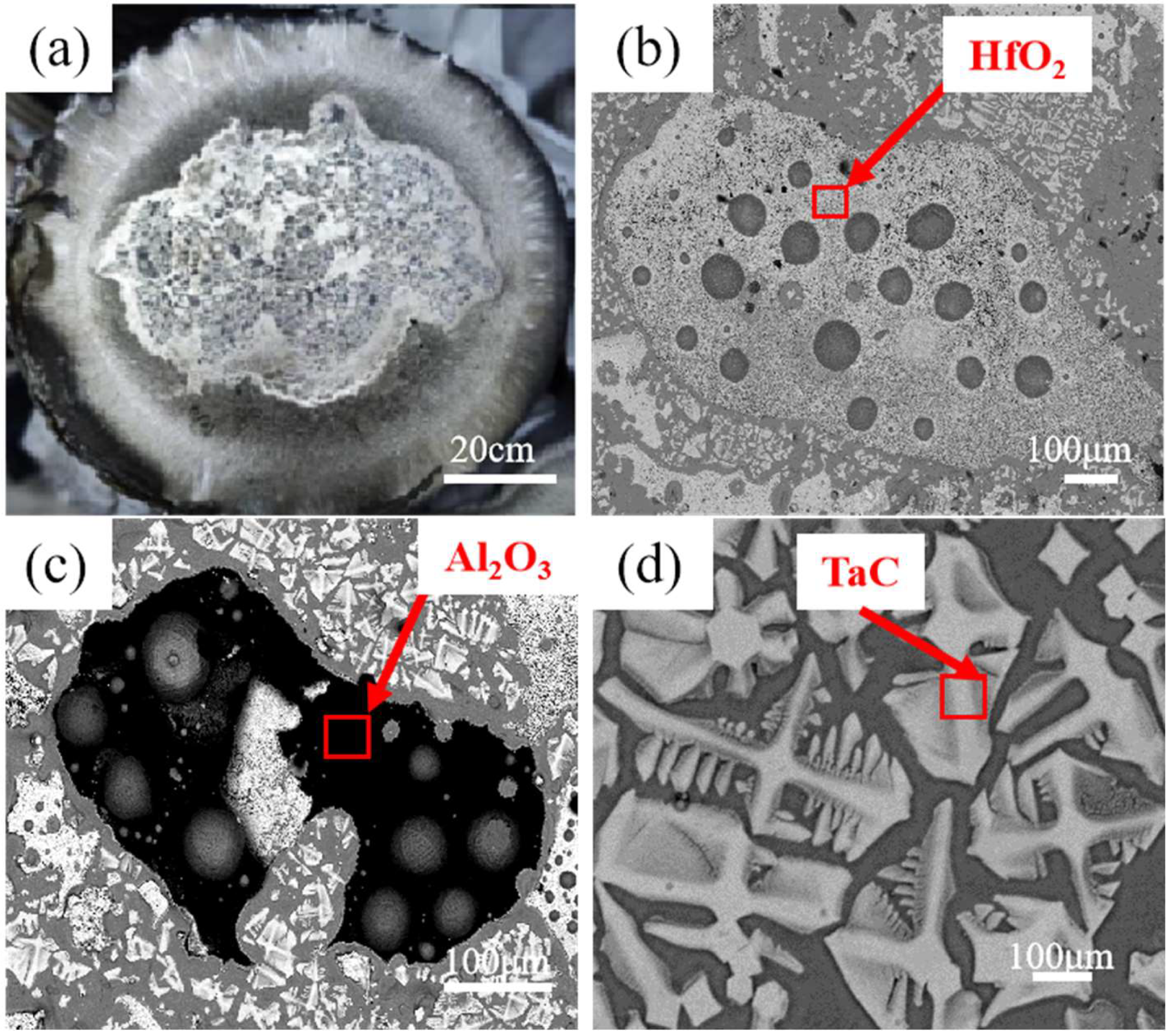 - After EBM of DZ125 revert material, the morphology and composition of the slag at the top of the ingot were analyzed. Volatilization of major alloying elements occurred, while MC-type carbides (TaC and HfC) formed at the interface between the slag and crucible. The final solidification zone of the ingot contained oxides such as HfO2, TaC, and Al2O3, with HfO2 encapsulating Al2O3 particles, indicating that inclusions in the melt migrated to the ingot surface during melting.