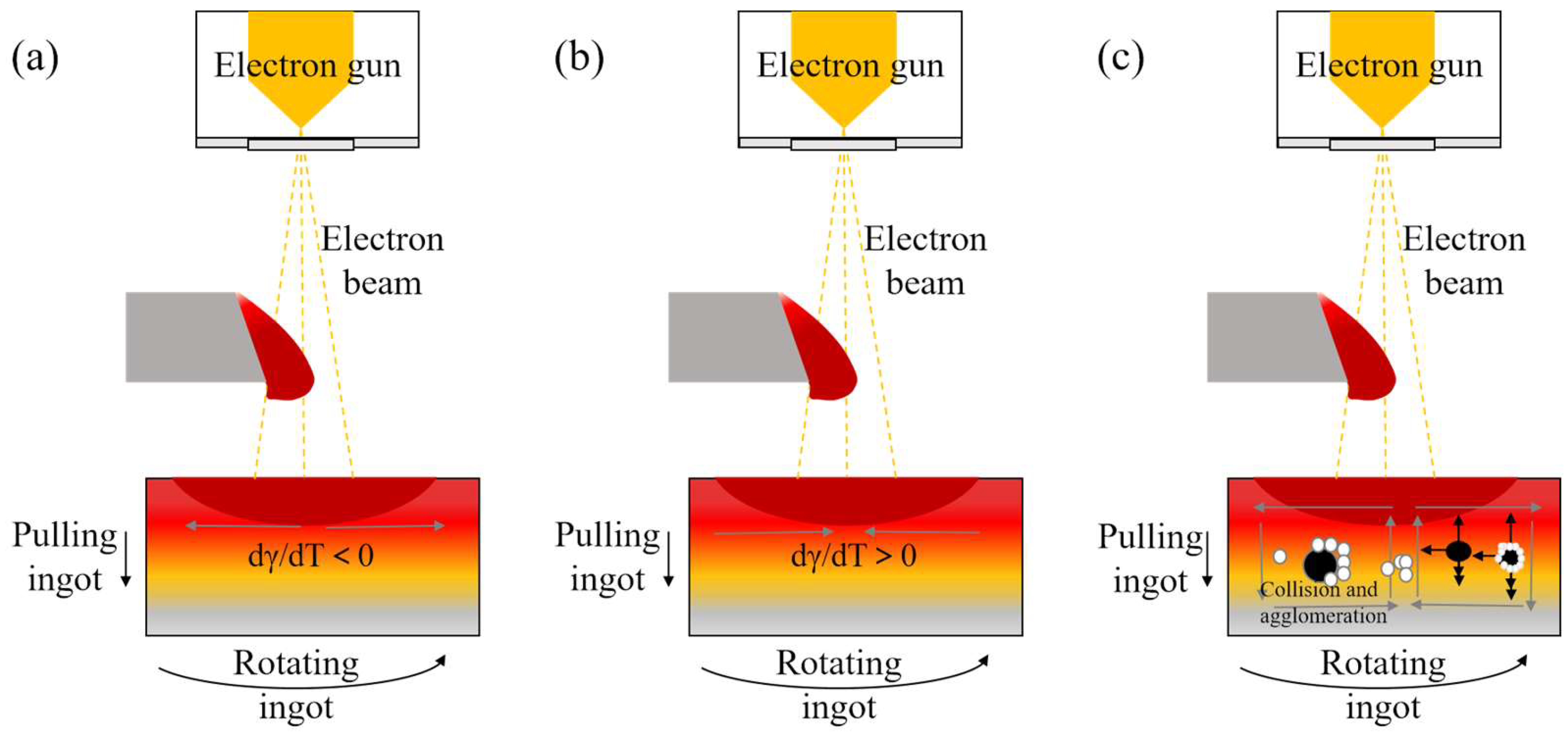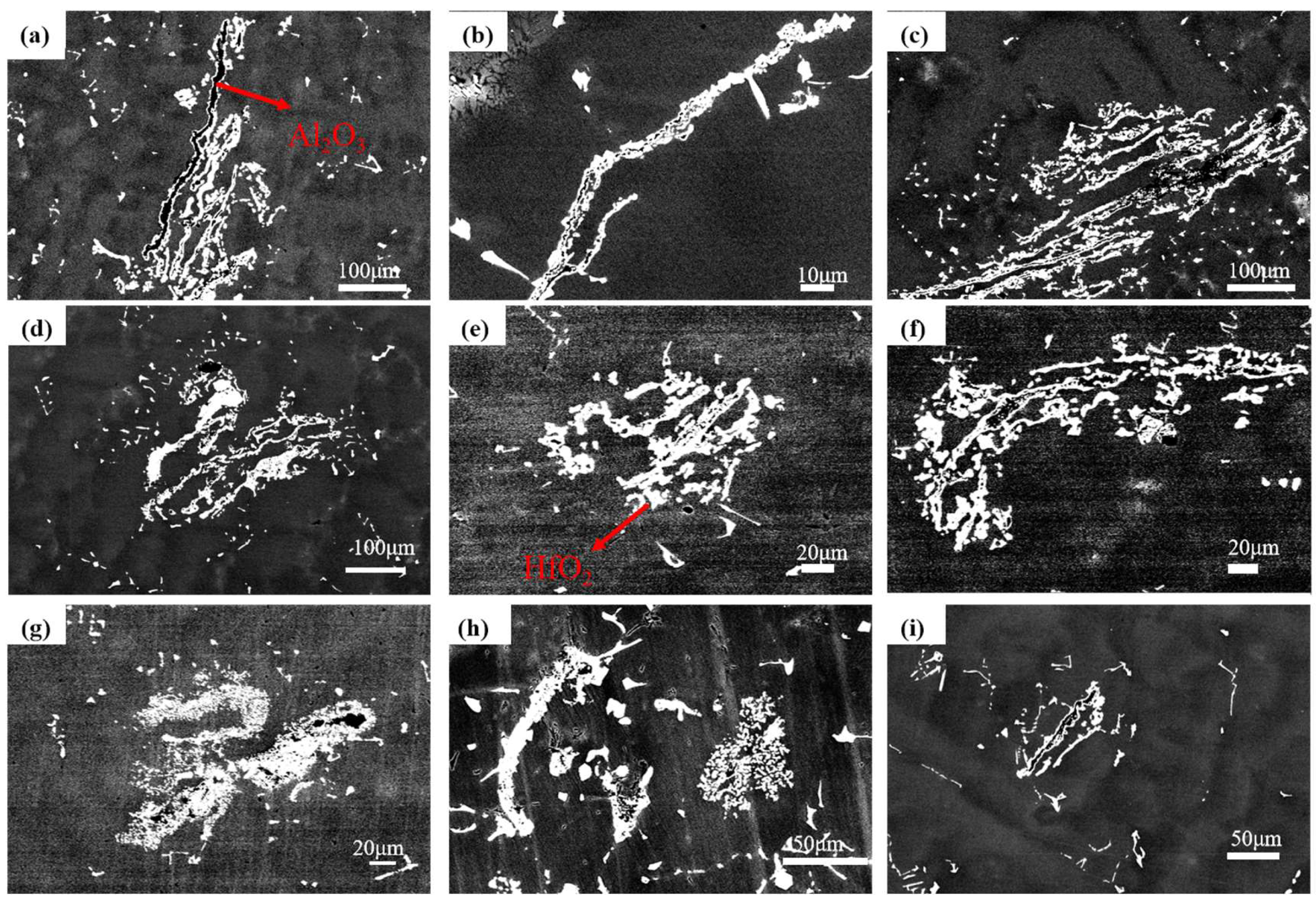 - Oxide inclusions were removed via two primary mechanisms: flotation and dissolution. Marangoni convection, droplet stirring, and centrifugal forces induced by the rotating ingot facilitated inclusion migration. Collision and agglomeration of inclusions occurred, with HfO2 aggregating around less dense Al2O3 particles, promoting their flotation, due to buoyancy. Additionally, the high-temperature, high-energy, and high-vacuum environment of EBM enabled the decomposition of HfO2 and Al2O3, further enhancing inclusion removal.