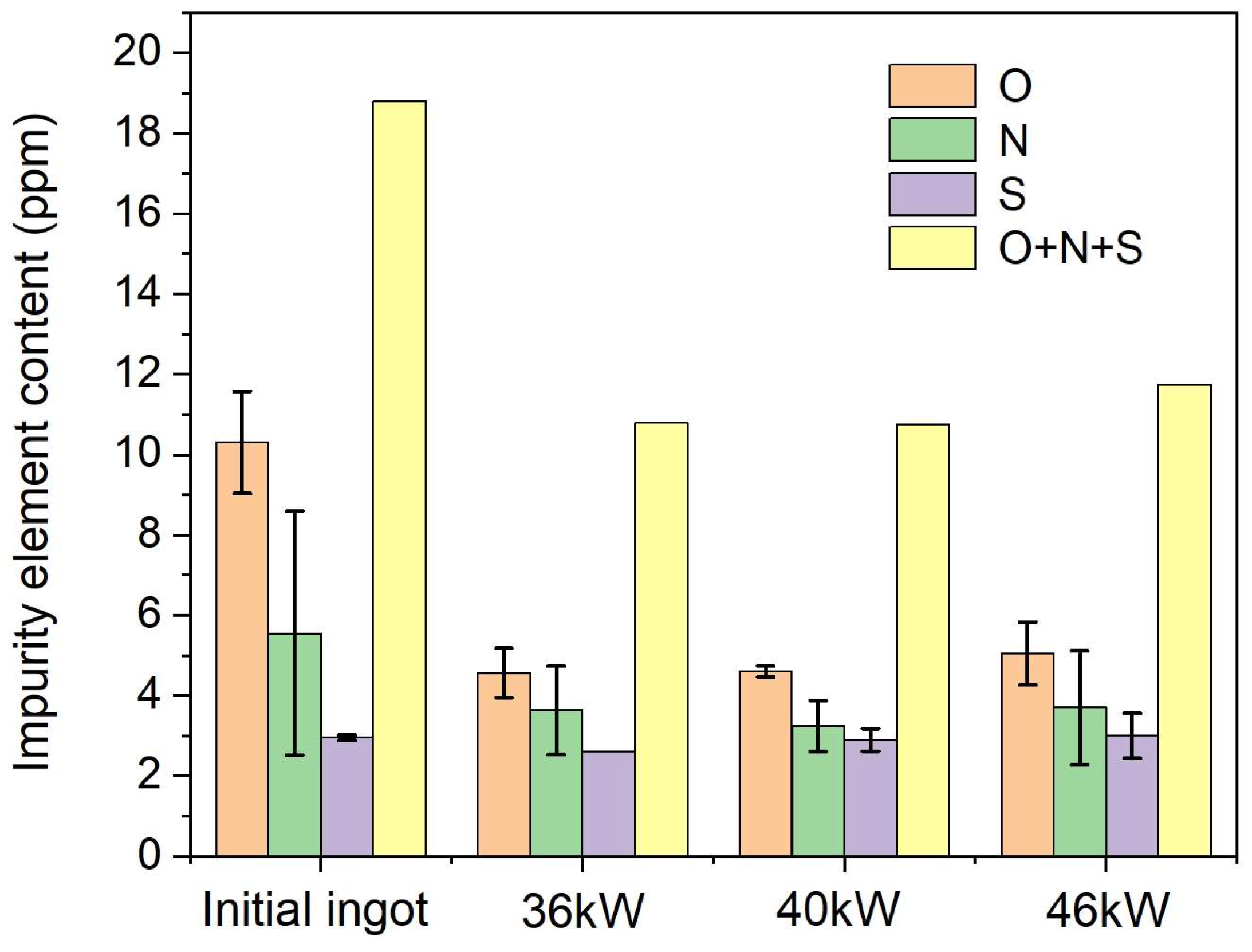 - Inclusions in the ingot were primarily HfO2 and Al2O3. As the EBM power increased, both the quantity and size of inclusions decreased, accompanied by reduced concentrations of interstitial impurities (O, N, S).