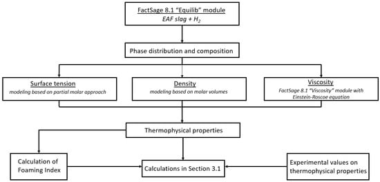 In this work, the thermochemical software FactSage 8.1 [47] was used to perform equilibrium calculations. The “Equilib” module was employed to simulate the reduction of liquid slag by H2, using the FactPS, FToxid, and FTmisc databases. The resulting liquid and solid phase compositions were then used to calculate the liquid slag viscosity using the Einstein–Roscoe model [48]. This model combines viscosity data obtained from the FactSage “Viscosity” module with the influence of the solid fraction determined by the “Equilib” module.