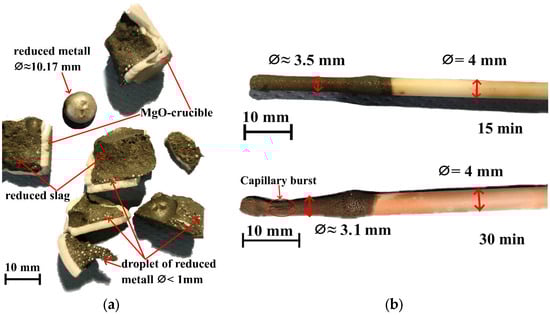 (a) Crushed MgO crucible after 30 min reduction time and (b) pictures of capillaries after experiments.