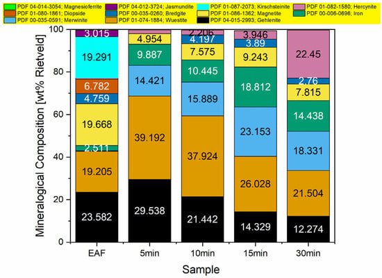The initial EAF slag is mainly composed of gehlenite (Ca2Al(Al,SiO7)), wüstite (FeO), magnetite (Fe3O4), and kirschsteinite (CaFeSiO4). As observed after the reduction experiments, the main iron oxide phase was wüstite. However, due to the presence of very small metal particles in the slag—which did not have sufficient time to coagulate into larger particles that would be easier to separate—different amounts of metallic iron were detected in all samples.