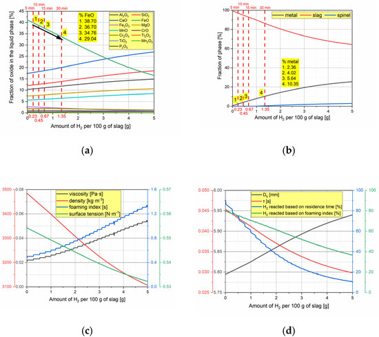However, reduction reactions induced by H2 injection alter the chemical composition and, consequently, the thermophysical properties of the slag. To study these changes, thermochemical software FactSage 8.1 with the “Equilib” module was utilized. Figure 4a,b show the changes in the liquid phase composition and phase fractions as a result of the reduction reaction, with points 1, 2, 3, and 4 corresponding to 5, 10, 15, and 30 min of injection time, respectively. After 30 min of reduction, FactSage predicts that 29.04% of FeO remains in the liquid slag, while the metallic phase weighs 10.35 g. Concurrently, the fraction of solid spinel phase gradually increases, which may enhance foam stability [54]. Figure 4a further illustrates that the primary changes in the liquid phase composition are due to the reduction of iron oxide to metallic iron, while the content of other components shifts only due to the redistribution caused by FeO reduction.
