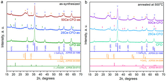 Annealing at 500 °C led to an increase in the lattice parameter of the CFO sample to 8.347 ± 0.002 Å, accompanied by a growth in crystallite size to 20 nm (Figure 1b). This behavior can be attributed to thermal relaxation of internal strain and improved crystallinity of the spinel phase. After annealing at 500 °C, the 25Ce-CFO sample consists of CoFe2O4, CeO2, and hematite (α-Fe2O3) (Figure 1b). B. Liu et al. [23] obtained similar results, where the hematite phase is formed in the system with Fe excess. Annealing does not change the phase composition of the 50Ce-CFO material, which consists of two crystalline phases: CoFe2O4 and CeO2 (Figure 1b). An increase in the lattice parameter of the cobalt ferrite phase is observed from 8.326 ± 0.009 Å to 8.340 ± 0.003 Å, accompanied by a minor reduction in crystallite size to approximately 15 nm. The increase in lattice parameter is caused by the relaxation of microstrain and surface stresses, as well as partial cation redistribution due to annealing at 500 °C. The similar Δa values for CFO and 50Ce-CFO support this strain-driven origin. The reduction in crystallite size of 50Ce-CFO can be attributed to Zener pinning [36]: CeO2 nanodomains segregated at spinel grain boundaries form a pinning pressure, which suppresses boundary migration and may cause fragmentation of ferrite crystallites, which is observed as an integral decrease in crystallite size.