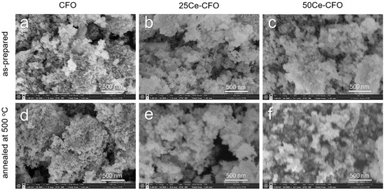 After annealing, the sample CFO still exhibits well-defined small nanograins that tend to aggregate (Figure 2d). Its structure remains dense. Conversely, the 25Ce-CFO sample after annealing at 500 °C (Figure 2e) exhibits a more porous structure, with less densely packed particles. The individual particles appear slightly larger than those found in pure cobalt ferrite. This could be attributed to the presence of Ce ions, which may slow down crystallization and result in less compact aggregation, creating a looser morphology. The 50Ce-CFO sample (Figure 2f) is significantly more amorphous. The SEM image reveals a smoother texture rather than individual particles, likely due to considerable distortion in the cobalt ferrite crystal lattice caused by the higher Ce content. Given that CeO2 segregates as a separate phase on the surface of cobalt ferrite, it acts as a growth inhibitor and restricts grain growth.