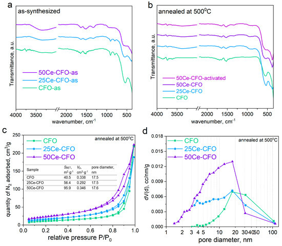 (a,b) FTIR spectra of Ce-containing cobalt ferrite: (a) as-synthesized; (b) annealed at 500 °C. (c) N2 adsorption/desorption isotherms. (d) Pore size distribution.
