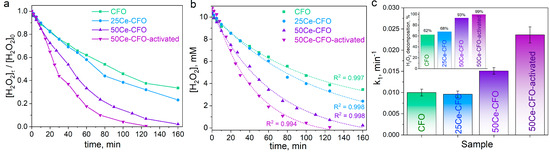 The catalytic activity of cerium-containing samples in H2O2 decomposition is illustrated in Figure 4. Among the annealed samples, the 50Ce-CFO sample exhibits the highest activity in H2O2 decomposition, fully decomposing 10 mM H2O2 in 160 min (Figure 4a). In contrast, the CFO and 25Ce-CFO samples show decomposition rates of 66% and 77%, respectively (as shown in Figure 4a). Notably, the activated sample significantly outperforms these others by completely depleting H2O2 in just 125 min. This enhanced performance can be attributed to the formation of surface oxygen vacancies and Ce3+ species, as treatment with H2O2 can reduce Ce4+ to Ce3+, thus creating Ce4+/Ce3+ redox pairs along with oxygen vacancies in CeO2 [40]. The kinetics of H2O2 depletion closely align with a pseudo-first-order kinetic model, demonstrating excellent correlations, with R2 values exceeding 0.994 (Figure 4b). The adherence to the PFO model indicates that the catalyst surfaces possess stable active sites, such as redox pairs like Co3+/Co2+, Fe3+/Fe2+, and Ce4+/Ce3+, that are uniformly distributed and present in substantial excess, ensuring that their concentration does not limit the reaction. Moreover, the decomposition of H2O2 occurs in the solution phase near the catalyst surface and does not require primary adsorption of H2O2 [27]. Importantly, there is a lack of radical chain effects; if the reaction were to proceed via radicals (such as HO• or HOO•), which could accelerate H2O2 decomposition, the kinetics would be more complex or exhibit autocatalytic behavior [41,42]. The rate coefficients were calculated (Figure 4c), revealing that the highest values were observed for both catalysts, 50Ce-CFO and 50Ce-CFO-activated, 0.0151 and 0.0236 min−1, respectively. Additionally, the post-synthesis activation of the catalyst surface with H2O2 further improves efficiency: the 50Ce-CFO-activated sample has a rate coefficient that is nearly 56% greater than that of the untreated 50Ce-CFO sample. This finding confirms that the treatment of the sample with H2O2 effectively increases the exposure of catalytic sites, probably cleaning the surface, and creates additional oxygen vacancies [40].