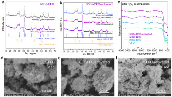 Stability of the catalysts: (a) XRD of 50Ce-CFO catalyst before and after H2O2 decomposition; (b) XRD of 50Ce-CFO catalyst before activation, after activation, and after H2O2 catalytic decomposition. (c) FTIR spectra of the used catalysts. (d–f) SEM images of catalysts.