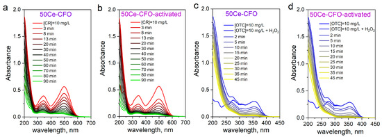UV–vis spectra of (a,b) Congo Red dye and (c,d) oxytetracycline in time degraded using untreated and activated 50Ce-CFO samples (conditions: [catalyst] = 1 g/L, [CR] = 10 mg/L, [OTC] = 10 mg/L, [H2O2] = 10 mM, T = 295 K, pH~7).