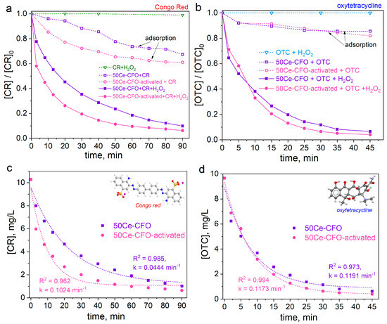 Adsorption and catalytic properties of untreated and activated 50Ce-CFO sample: (a) Congo Red removal; (b) OTC removal; (c) PFO model for CR degradation; (d) PFO model for OTC degradation (k is rate coefficient; conditions: [catalyst] = 1 g/L, [CR] = 10 mg/L, [OTC] = 10 mg/L, [H2O2] = 10 mM, T = 295 K, pH~7).