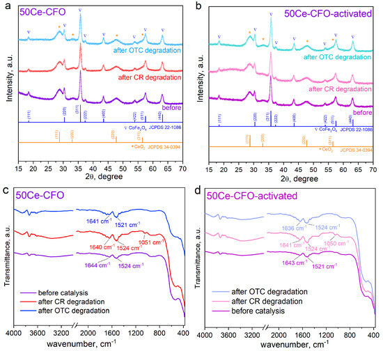 Figure 8 shows the changes in the structural stability of the used catalysts, checked with XRD and FTIR techniques. Figure 8a,b shows that after catalytic application of the 50Ce-CFO sample for the decomposition of Congo Red, the cobalt ferrite phase in the sample retains a lattice parameter of 8.332 ± 0.004 Å, with an average crystallite size of 18 nm. These values indicate that the spinel structure remains structurally stable under reaction conditions, with no significant phase degradation or lattice distortion. The apparent increase in crystallite size may be attributed to the leaching and subsequent reduction in the relative amount of smaller particles, which leads to a shift in the average crystallite size toward larger domains. This effect reflects selective removal rather than actual particle growth during the catalytic process. At the same time, the average crystallite size of the CeO2 remains equal to approximately 4 nm. After the use of the 50Ce-CFO material as a catalyst for oxytetracycline degradation, the lattice parameter of the cobalt ferrite phase remained unchanged with an average crystallite size of 15 nm. The CeO2 phase also retains particle size unchanged. These results indicate that no significant structural changes occur in the composite during the catalytic process, confirming its phase and microstructural stability under the applied reaction conditions.