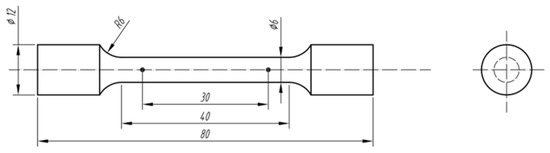 Mechanical properties of the base metal and weld metals were determined by uniaxial tensile testing and test procedure followed the test standard GB/T 228.1-2021 [34]. Round bar specimens were employed for the test as shown in Figure 1, with a gauge length of 30 mm and a diameter of 6 mm. The tests were conducted on an MTS E45.105 testing machine (maximum load capacity of 100 kN) at a crosshead speed of 0.9 mm/min. The test results are presented in Figure 2.