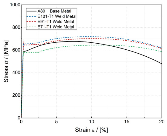 Figure 2 illustrates that the weld metals constructed using different welding materials exhibited significant differences in strength. The weld metal made from E101T1 exhibited the highest strength, followed by E91T1, while the weld metal from E71T1 exhibited the lowest strength. The weld metals from E101T1 and E91T1 demonstrated higher strength compared to the base metal, indicating over-matched welds, whereas the E71T1 weld metal exhibited lower strength relative to the base metal, indicating an under-matched weld. Each material was subjected to three replicate uniaxial tensile tests, with the mean values of yield strength and tensile strength recorded in Table 2.