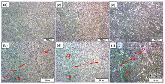 X80 weld metal metallographic characteristics: (a) E101T1 200×; (b) E101T1 500×; (c) E91T1 200×; (d) E91T1 500×; (e) E71T1 200×; (f) E71T1 500×.