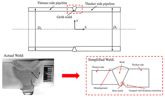 However, the previously mentioned studies primarily focused on girth welds with regular geometric configurations. Current failure analyses indicate that girth weld failures are frequently associated with geometric discontinuities [21,22]. Geometric discontinuities arise from specific engineering contexts, such as misalignment and unequal wall thickness. Although international pipeline standards strictly limit girth weld misalignment [23] and alignment clamps and other fixtures were employed during the construction process, systematic investigations have consistently identified numerous welds in practical engineering exhibiting misalignment significantly exceeding the limit [13]. Additionally, wall thickness transition represents an intrinsic design requirement for pipelines. When pipelines must accommodate varying operational conditions—including high-pressure segments, geological hazard areas, and densely populated area crossings—modifications to the pipeline’s mechanical properties become necessary, inevitably leading to the formation of girth welds between pipes of dissimilar wall thicknesses [24].