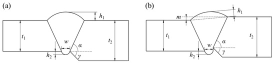 This study included two separate girth weld geometric configurations: girth welds with only unequal wall thickness and girth welds with both unequal wall thickness and misalignment. Figure 5 shows the cross-sectional profiles and geometric parameters for each type of weld. The comprehensive modeling process is described in Section 3.3. The geometric parameters employed for the modeling process are presented in Table 3, with this combination intended to represent the typical geometric features of girth welds in engineering practice.