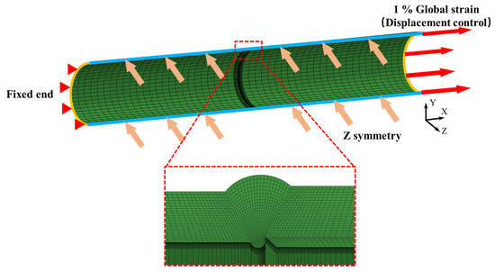 Each finite element model had a total length of 8000 mm with a thin-walled pipe outer diameter D of 1219 mm. To enhance computing efficiency, a half-symmetric pipeline finite element model was established, taking into account the model’s symmetry. The model’s symmetry plane was the x-y plane, with z-direction symmetric boundary conditions applied. The left end of the pipe was fixed. An axial displacement load in the x-direction was delivered at the right end of the weld by reference point coupling. The load magnitude was set at 1% of the entire pipe length. Displacements in other directions were restricted to prevent unexpected rigid body motion in the model.
