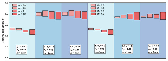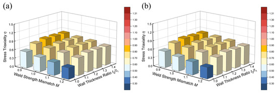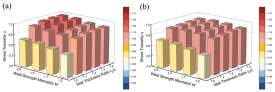 The increase of M significantly reduced stress triaxiality at the weld root position. For equal wall thickness girth welds (t2/t1 = 1.0), the reduction in η was 0.180 as M rose from 0.9 to 1.2. This decreasing effect was also observed in unequal wall thickness girth welds. In the girth welds with t2/t1 = 1.4, the reduction in η due to the increase in M was only 0.136, which was smaller than the reduction noted in the equal wall thickness girth welds. The comparison of Figure 7a,b demonstrates negligible changes in the calculation results between the conditions of λw = 0.85 and λw = 0.95, suggesting that λw had minimal influence on η in the girth welds without misalignment.