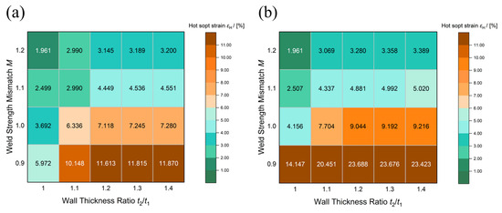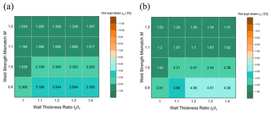 Geometrical features and material properties significantly influenced the hot spot strain εH. Figure 8 illustrates the εH changed with t2/t1 and M under two λw conditions. The results demonstrate that, under determined M and λw conditions, the εH initially increased and then decreased with increasing t2/t1, peaking at t2/t1 = 1.2. Quantitative analysis indicates that M significantly affected the εH sensitivity. In Figure 8a, girth welds with λw = 0.85 showed a 1.24% increase in εH due to t2/t1 variations when M = 0.9, compared to 0.32% for M = 1.2, demonstrating that weld metal strength enhancement significantly diminishes the effect of t2/t1 on εH. The comparison of Figure 8a,b indicates that the effect of λw was also influenced by weld metal’s strength. Under low-strength matching conditions (M = 0.9), as λw rose from 0.85 to 0.95, the εH increment due to t2/t1 increased from 1.24% to 1.96%. Under conditions of high strength matching (M = 1.2), the effect of λw was negligible.
