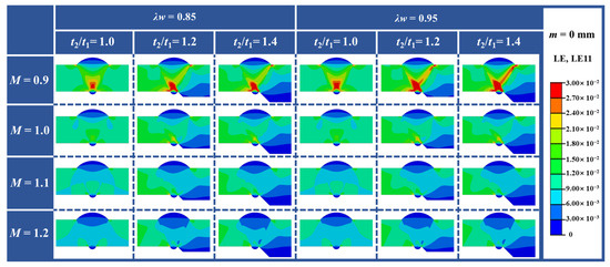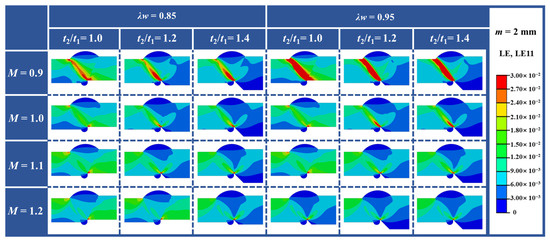 Figure 9 illustrates the axial strain distribution contours at 1% nominal pipeline strain, which validate the analysis results above. In low-strength matching welds with M = 0.9, the weld experienced an obvious strain concentration, which was exacerbated as t2/t1 increased. Increasing λw further exacerbated this strain concentration, causing the high-strain region to extend towards the cap weld toe when λw = 0.95. When M reached 1.0 or higher, strain concentration within the weld significantly diminished, and the influence of t2/t1 and λw was substantially reduced. When M = 1.2, the influence of geometric features and material parameters on strain distribution became negligible.