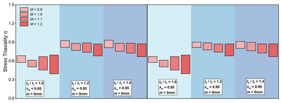 Figure 13 illustrates that the stress triaxiality at the weld root increased with internal pressure. This phenomenon arose from additional circumferential stress caused by internal pressure, which complicated the stress field at the root weld. Figure 14 demonstrates the variation of the increments in η resulting from increasing P, considering varying t2/t1, M, and λw. This figure illustrates that η became more sensitive to P variations as M increased. For example, in girth welds with λw = 0.85 and t2/t1 = 1.0, the increments in η caused by internal pressure at M = 0.9 and 1.2 were 0.11 and 0.30, respectively. Higher weld strength made it more difficult to release the additional stress caused by internal pressure through deformation, resulting in more pronounced increments in η with increasing internal pressure.