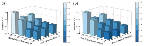 The increment of η resulted from P increasing in the girth welds with 2 mm misalignment: (a) λw = 0.85; (b) λw = 0.95.