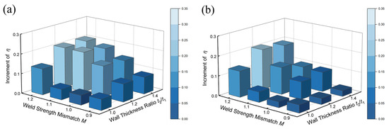 The increment of η resulted from P increasing in the girth welds without misalignment: (a) λw = 0.85; (b) λw = 0.95.