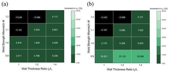 The increment of εH resulted from P increasing in the girth welds without misalignment: (a) λw = 0.85; (b) λw = 0.95.