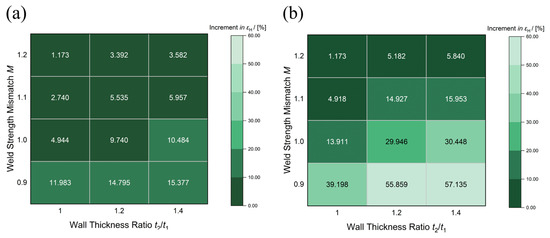 As Figure 17 illustrates that in the girth welds without misalignment, the sensitivity of εH to P variations increased with increasing t2/t1 and decreased with M increasing, and M had a more significant influence. For the girth welds with low strength matching (M = 0.9), εH significantly increased with P increasing. In the girth welds with λw = 0.85, the increments in εH were 2.51% and 5.34% when t2/t1 = 1.0 and 1.4, respectively. As M increased, the sensitivity of εH decreased sharply, and εH even decreased with P increasing in the girth welds with M ≥ 1.1. This decline occurred because the base metal bore the deformation induced by internal pressure in the high-strength matching girth welds. The comparison of Figure 17a,b demonstrates that λw significantly affected εH in the girth welds with internal pressure. The εH increments in girth welds with M = 0.9 and t2/t1 = 1.4 increased from 5.33% to 26.7% as λw increased from 0.85 to 0.95.