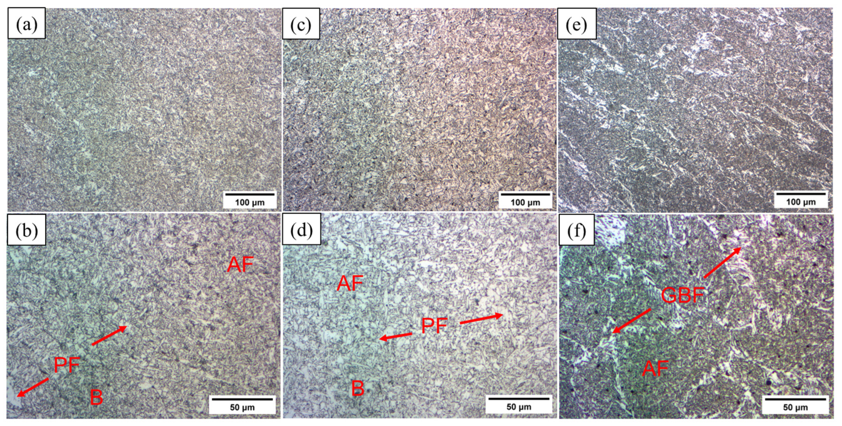 - Experimental characterization reveals that weld metal strength variations (M = 0.97–1.11) primarily result from differences in Mn and Ni content in the welding materials. These two elements provide significant solid solution strengthening effects and adjust phase transformation temperatures to promote the formation of fine acicular ferrite, improving the microstructure and enhancing the strength of the weld metals.