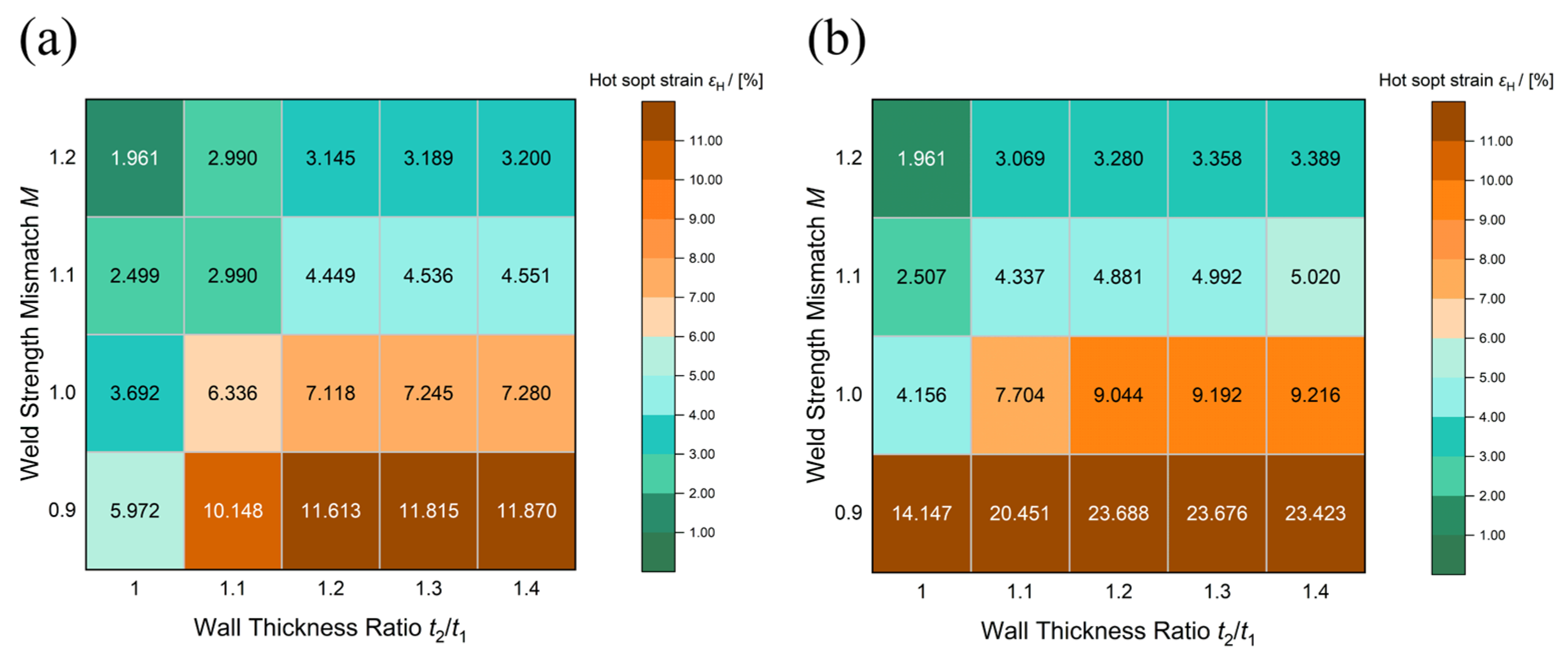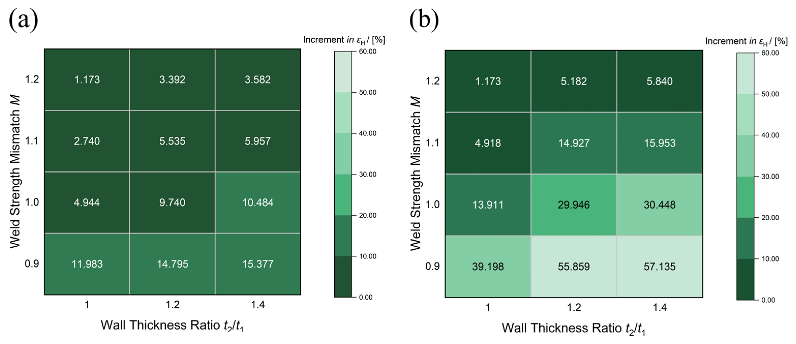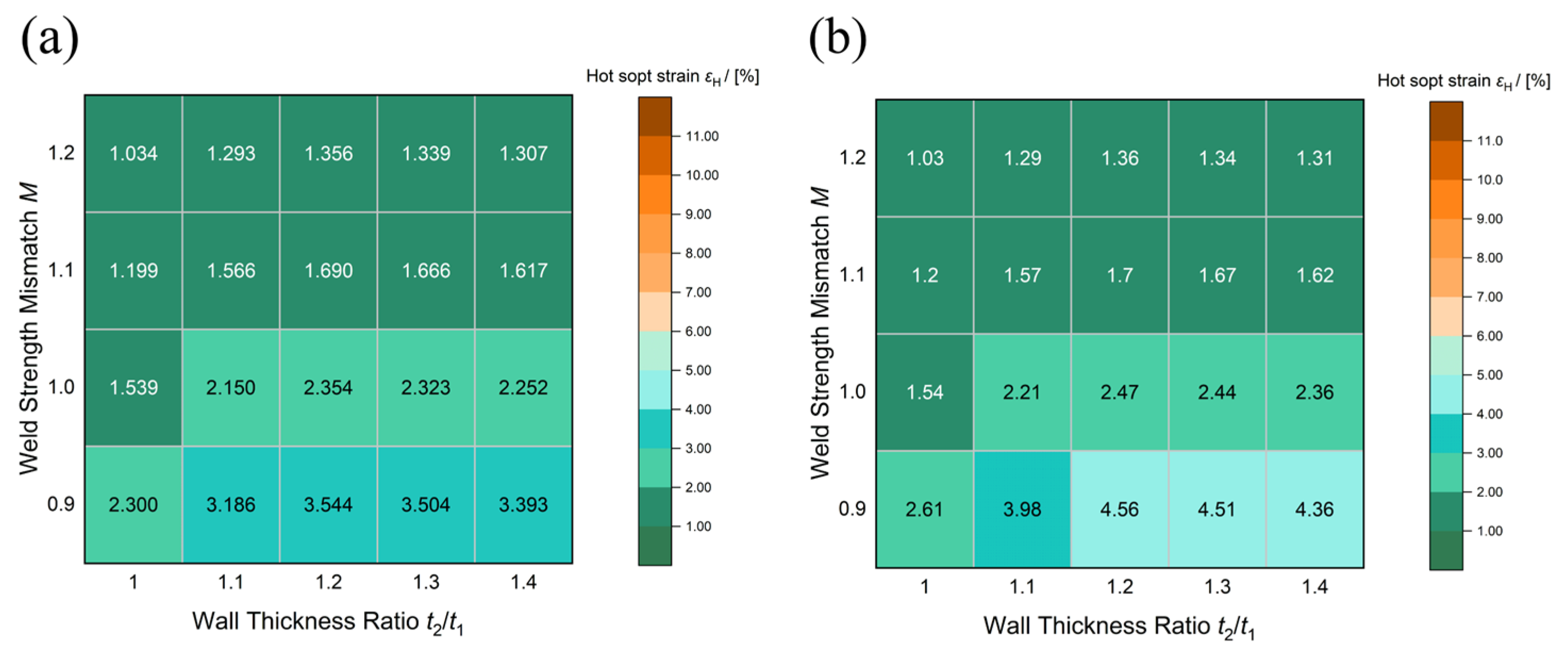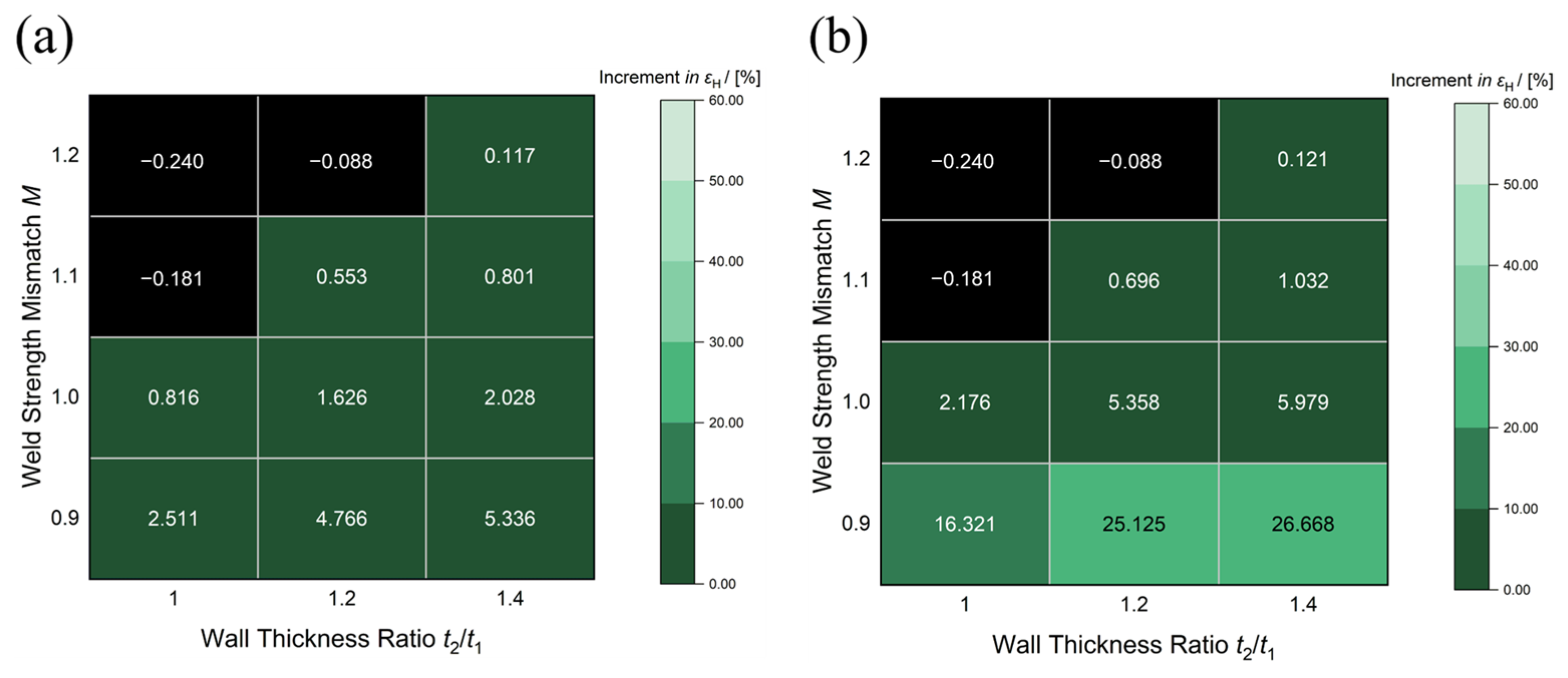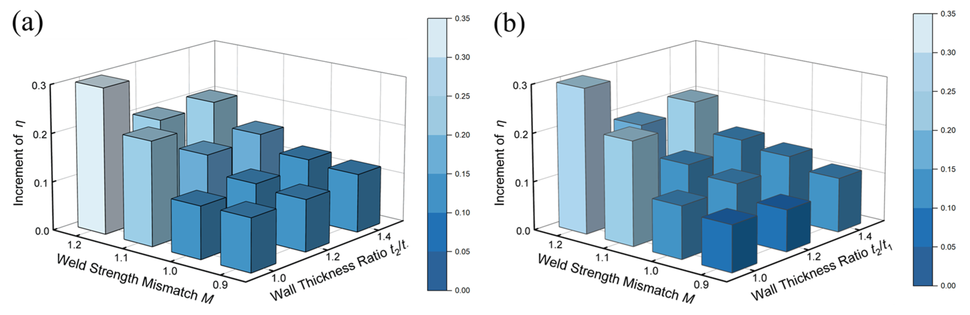 - Weld metal properties significantly affect girth weld stress–strain states. Calculation results indicate that increasing M reduces stress–strain concentration, but its effectiveness diminishes with geometric discontinuity. For m = 0 and t2/t1 = 1.0, raising M from 0.9 to 1.2 reduced η by 0.180; however, for m = 2 mm and t2/t1 = 1.4, the reduction was only 0.097. Higher λw reduces η and increases εH, particularly in undermatched welds with misalignment.
