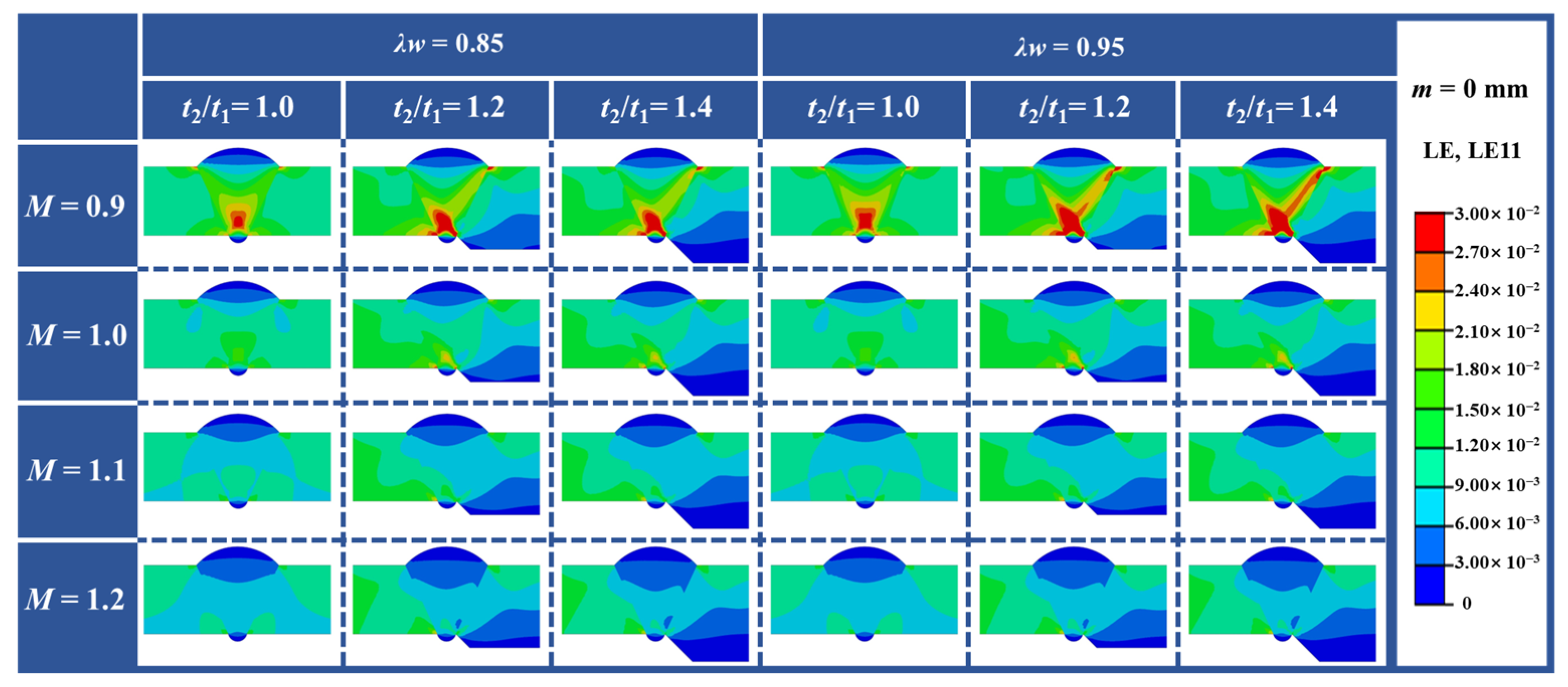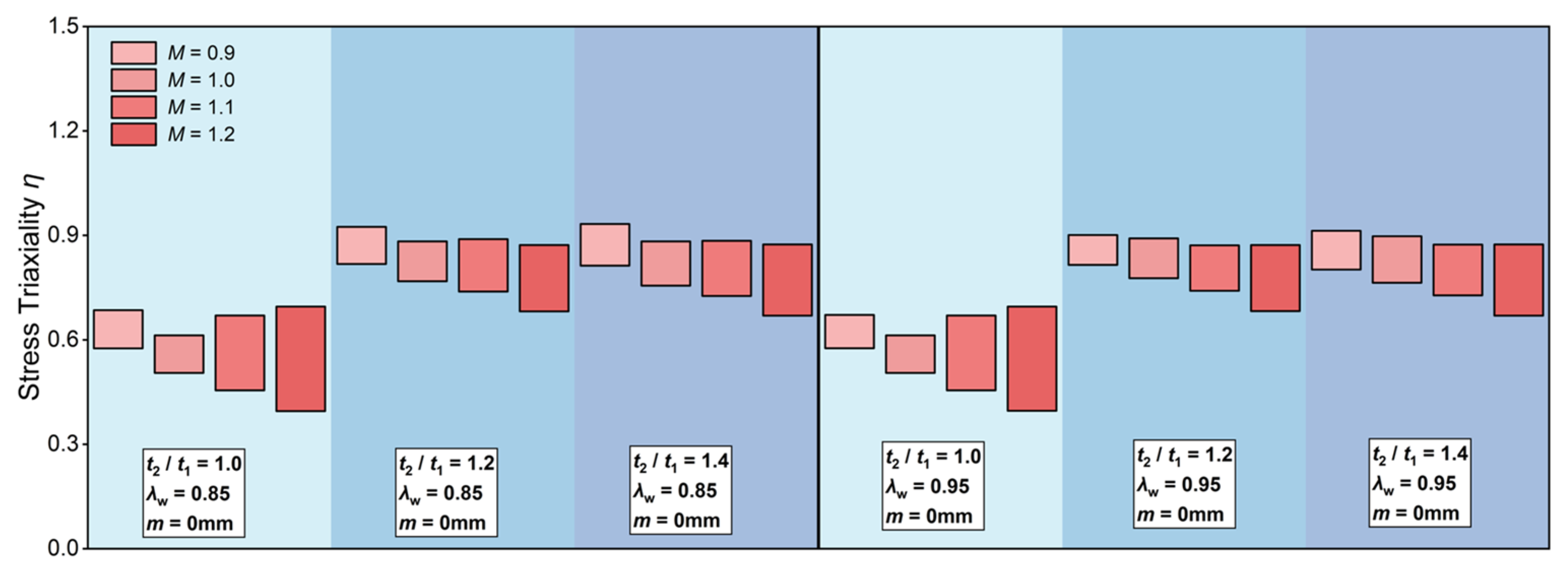 - Numerical simulation demonstrates that internal pressure significantly increases stress triaxiality η and hot spot strain εH at the weld root. The effects of t2/t1, m and λw on stress and strain states are more pronounced under internal pressure-loaded conditions. Higher M intensifies the stress triaxiality response to internal pressure while effectively reducing strain concentration sensitivity.