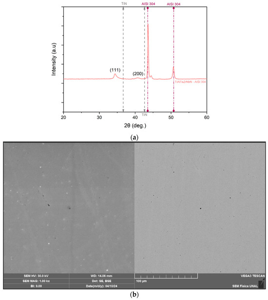 The (TiAlZrTaNb)Nx coatings deposited on AISI 304 stainless steel exhibited a face-centered cubic (FCC) crystal structure with a preferential orientation along the (111) plane, a lattice parameter of 0.4526 nm, and an average crystallite size of 18.20 nm. The coatings demonstrated a near-equiatomic composition, with average elemental concentrations of Ti (23.79%), Nb (23.38%), Zr (19.09%), Al (17.50%), and Ta (16.24%). SEM and three-dimensional optical microscopy analyses revealed that the coatings formed dense, homogeneous layers with low surface roughness and a minimal concentration of micropores.