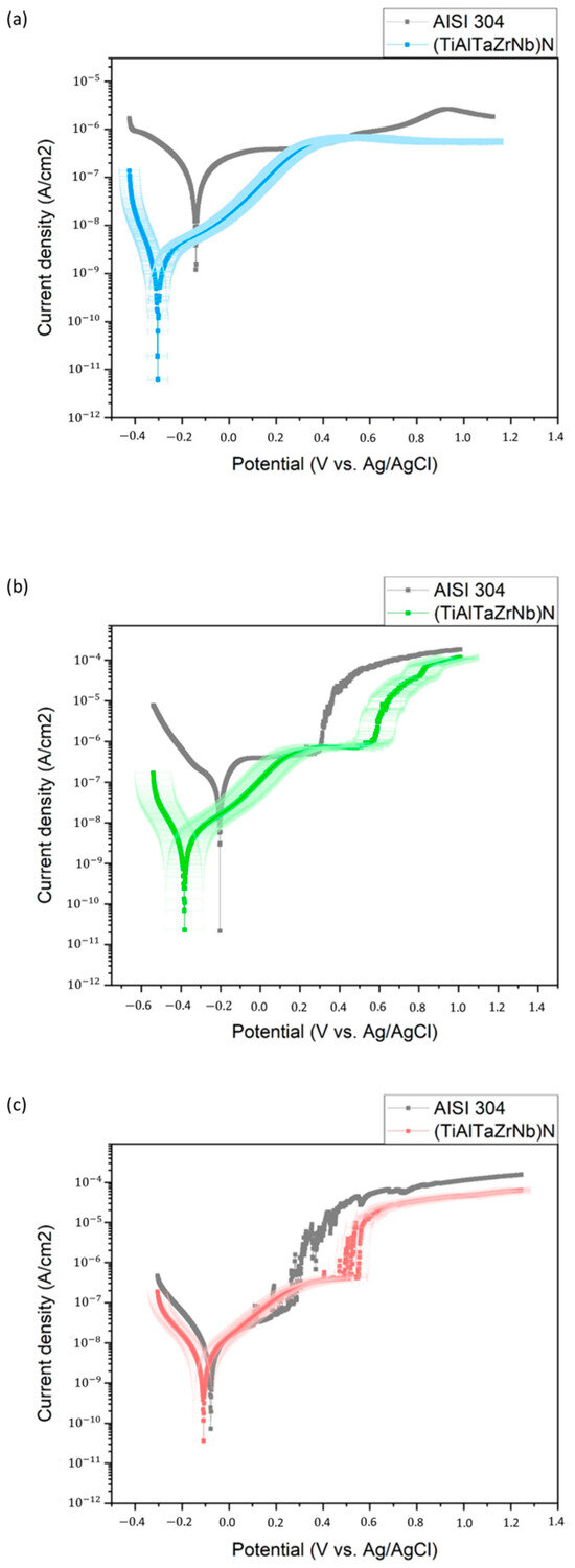 Potentiodynamic polarization curves of the substrate and the (TiAlTaZrNb)N coating; electrolytes: (a) acetic acid solution; (b) citric acid solution; and (c) tap water.