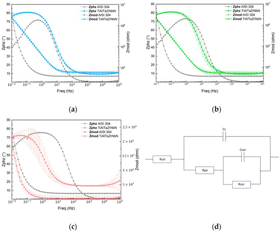 Phase angle and impedance modulus for AISI 304 substrate and TiAlTaZrNbN coating as a function of frequency in: (a) acetic acid solution; (b) citric acid solution; (c) tap water; and (d) Diagram of electrical equivalent circuit model.