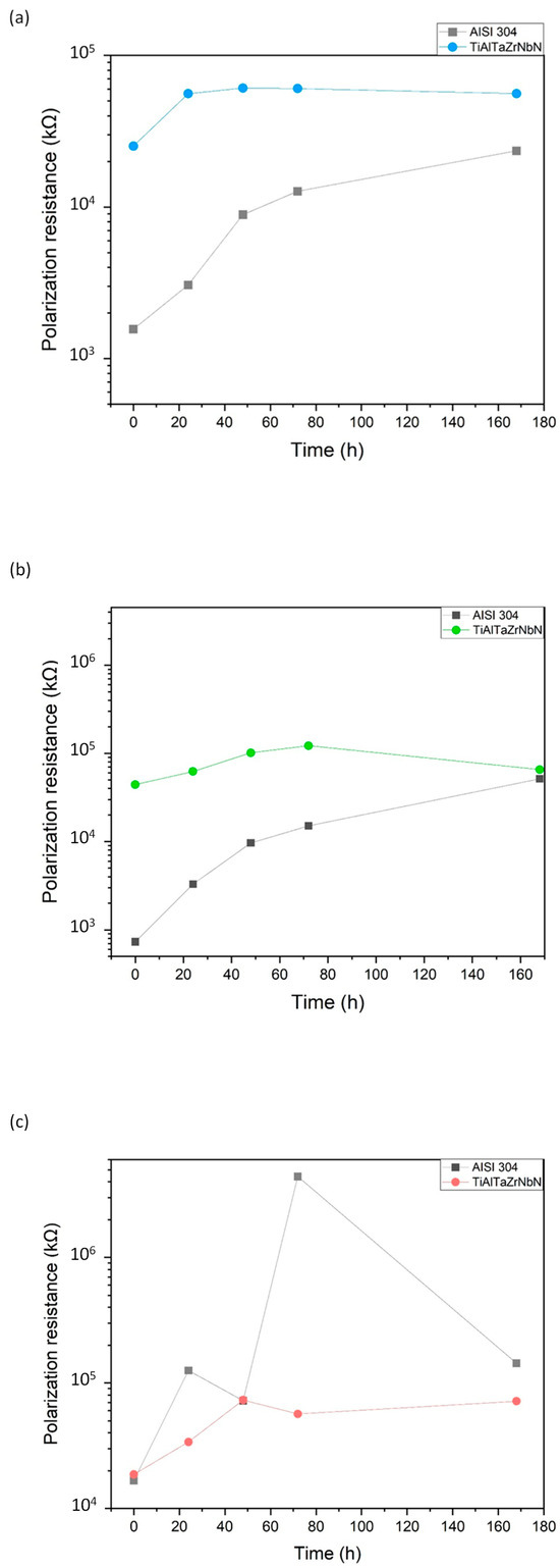Polarization resistance (Rp) of the AISI 304 substrate and the TiAlTaZrNbN coating in (a) acetic acid solution; (b) citric acid solution; and (c) tap water.