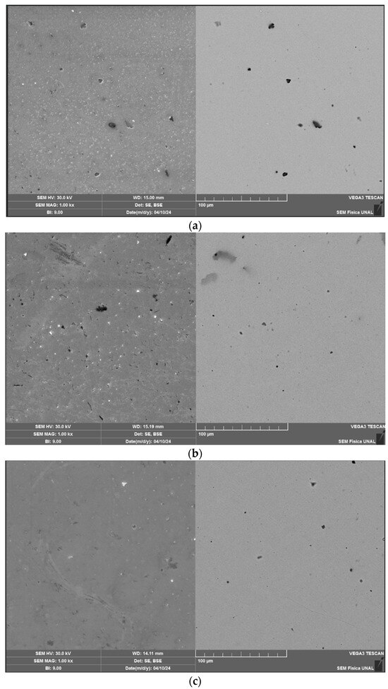 The chemical composition of the coatings was determined using energy-dispersive X-ray spectroscopy (EDS) with a Bruker Nano GmbH probe at a magnification of 500×. Sample morphology was characterized by scanning electron microscopy (SEM) using a Bruker Nano GmbH instrument, operating under vacuum pressures ranging from 4 × 10−2 to 5 Pa, with a working distance of 15 mm and magnifications of 500× and 1000×. An accelerating voltage of 30 kV was applied, and both secondary electron and backscattered electron detectors were utilized. Confocal laser scanning microscopy (CLSM) was performed with a Carl Zeiss microscope, acquiring images at a magnification of 500× at a minimum of two locations within the area of interest using a 47 μm pinhole and a 405 nm wavelength laser. This CLSM was used to measure thickness and roughness.