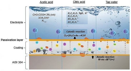 Figure 6 presents a schematic illustration of the possible mechanisms occurring in the coatings as a function of the three electrolytes used. The proposed corrosion mechanism for the coating–substrate system involves the diffusion of the electrolyte toward the AISI 304 substrate through defects (such as pores or cracks) present in the coating. The corrosion reactions are associated with the interaction between the anions from the electrolyte and the metallic ions of the substrate. Electrochemical studies indicate that cathodic reactions occur on the surface of the film, while anodic reactions take place at the substrate surface [37].