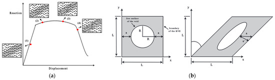 (a) Schematic representation of the process of nucleation, growth, and coalescence of micro voids, as well as the relationship with the macroscopic load; (b) the deformed configuration of void under shear stress. Reprinted with permission from ref. [27]. Copyright 2025 Elsevier.