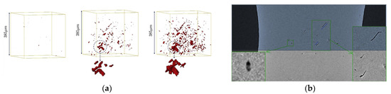 (a) A 3D view of damage in the controlled volume at the specimen center at different strain levels; (b) inclusion and elongated cavities obtained with the ID19 beamline observation. Reprinted with permission from ref. [38]. Copyright 2025 Elsevier.